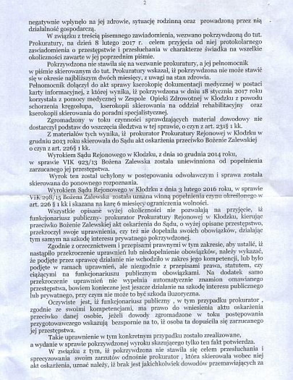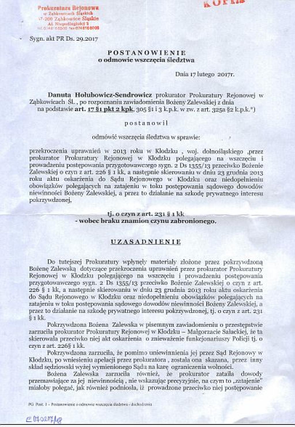 Prokuratura w Ząbkowicach Śląskich 17 lutego 2017 roku umorzyła sledztwo w sprawie popełnienia przestępstw przez prokurator Małgorzatę Sałacką złożonego przez Bożenę Zalewską (patrz dokumenty poniżej).