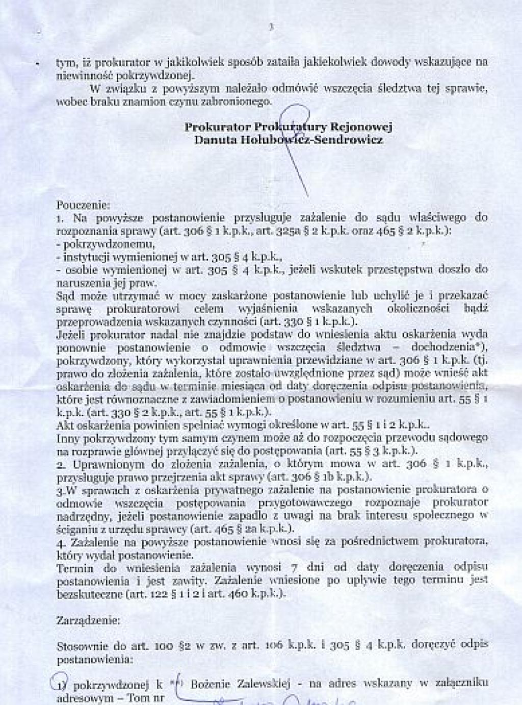 Bożena Zalewska: Prokurator Małgorzata Sałacka dała się okłamywać przez policjantów, zaniedbała obowiązki nie przesłuchując mnie ani nie konfrontując z funkcjonariuszami. Przespała rozprawy i jest bezkarna!