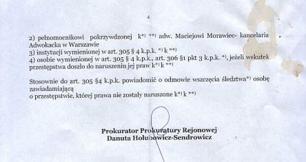 Biznesmenka w złożonym w 2016 roku zawiadomieniu o możliwości popełnienia przestępstwa niedopełnienia obowiązków i przekroczenia uprawnień przekonywała, że prokurator Małgorzata Sałacka powinna była doprowadzić do konfrontacji pomiędzy nią a policjantami przed sporządeniem aktu oskarżenia. Zarzuca prokuraturze w Ząbkowicach Śląskich, że umorzyła sprawę nie czekając na koniec jej zwolnienia lekarskiego umożliwiający złożenie obszernego zeznania obciążającego panią prokurator Małgorzatę Sałacką.