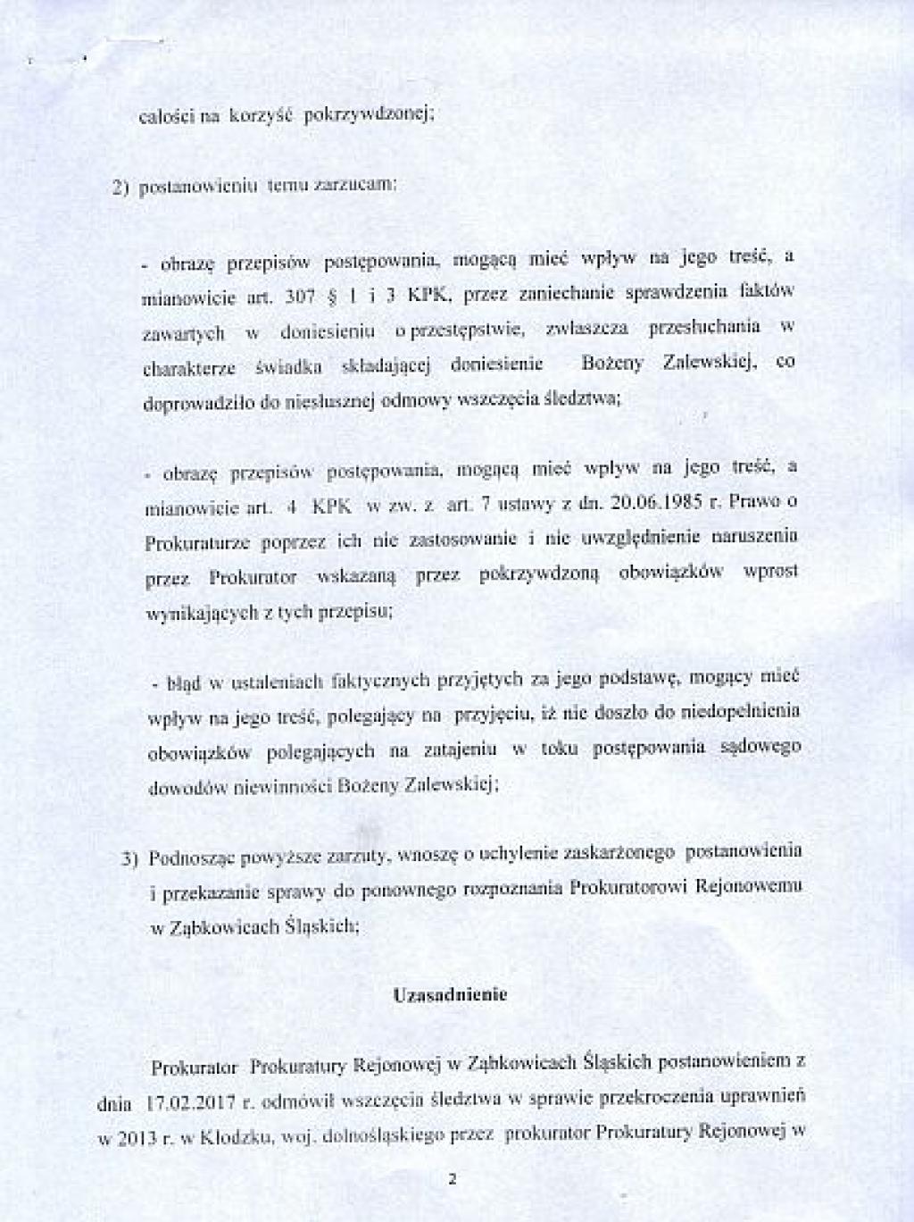 - Ta prokurator nawet nie postarała się o monitoringi tylko znalazły się one w sądzie na mój wniosek. Dała się jak dziecko okłamać w każdym zakresie przez policjantów, którzy podczas tej interwencji powiedzieli mi "pani jest jedna, a nas jest trzech". Okazało się jednak, że przegrana i śpiąca na procesach pani Prokurator ma silne powiązania w wymiarze sprawiedliwości na Dolnym Śląsku. I wygrywa wszystko co chce, choćby było to najbardziej absurdalne. Bo przecież tych okłamujących ją policjanów uznała w złożoinej apelcji "za bardzo wiarygodnych" - podsumowuje Bożena Zalewska.