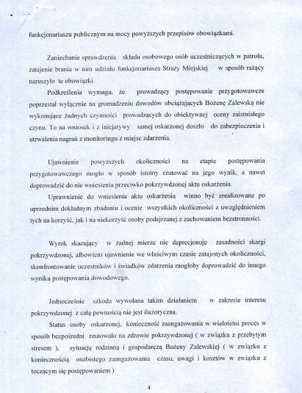 - Prokurator Małgorzata Sałacka dała się okłamać trzem policjantom, którzy ukryli przed nią obecność w radiowozie czwartej osoby będącej funkcjonariuszem Straży Miejskiej o nazwisku Arkadiusz Nowak. Wezwany przed oblicze sądu zeznał, że nie był świadkiem żadnego przestępstwa z mojej strony! - tłumaczy Bożena Zalewska.