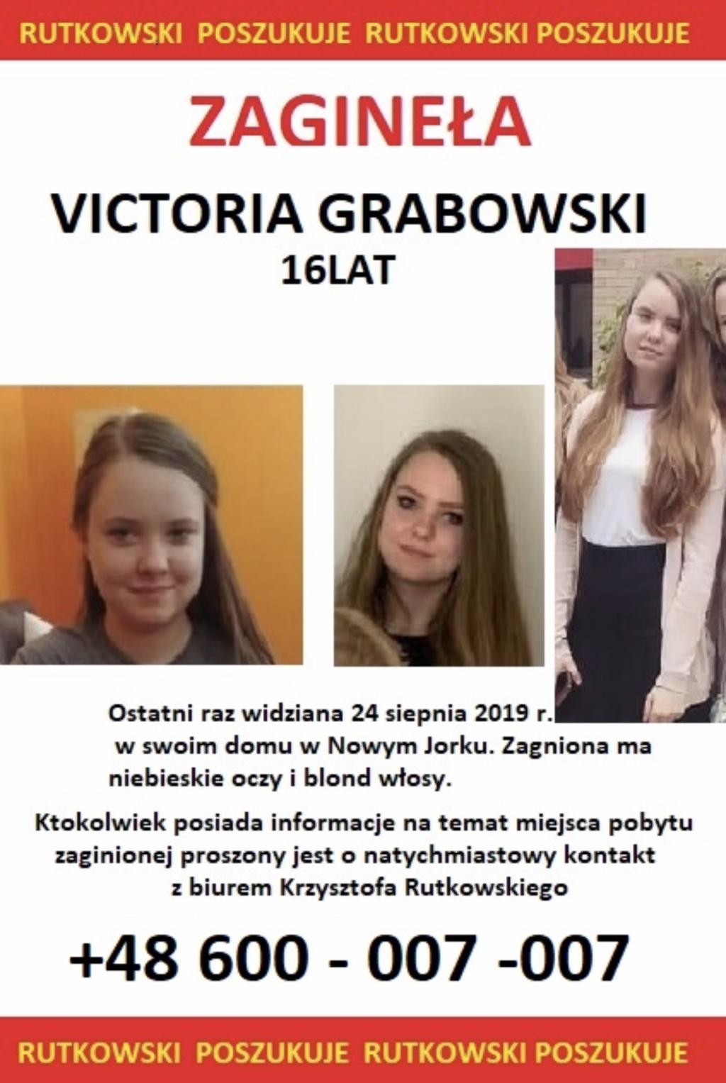 Rutkowski: 16-letnia VICTORIA GRABOWSKI zaginęła w Nowym Jorku. Czy wiesz, kto ją ukrywa w Wielkiej Brytanii? Dzwoń na nasz numer alarmowy +48 600 007007