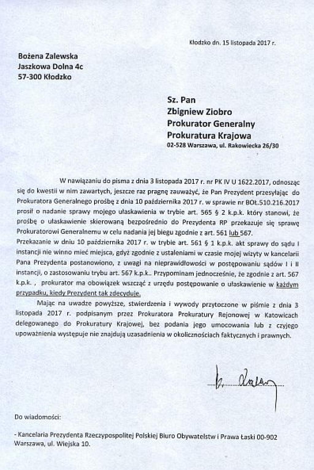 Bożena Zalewska informuje z kolei na bieżąco o działaniach Sądów w Kłodzku i Świdnicy Kancelarię Prezydenta gdzie złożyła wnioski o ułaskawienie. Oraz Biuro Poselskie Jarosława Kaczyńskiego wierząc w Dobrą Zmianę w polskich Sądach.