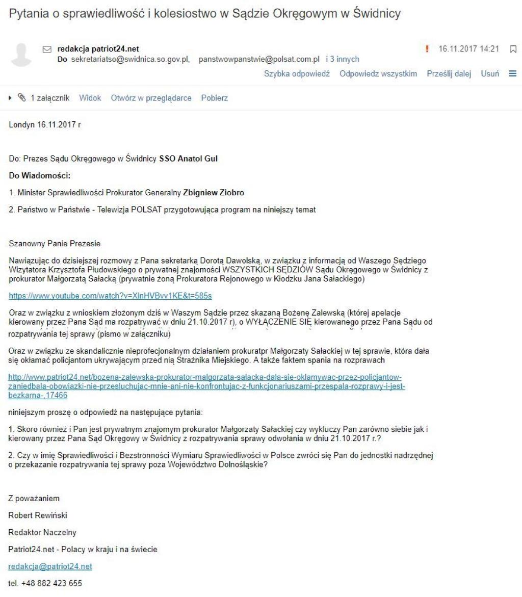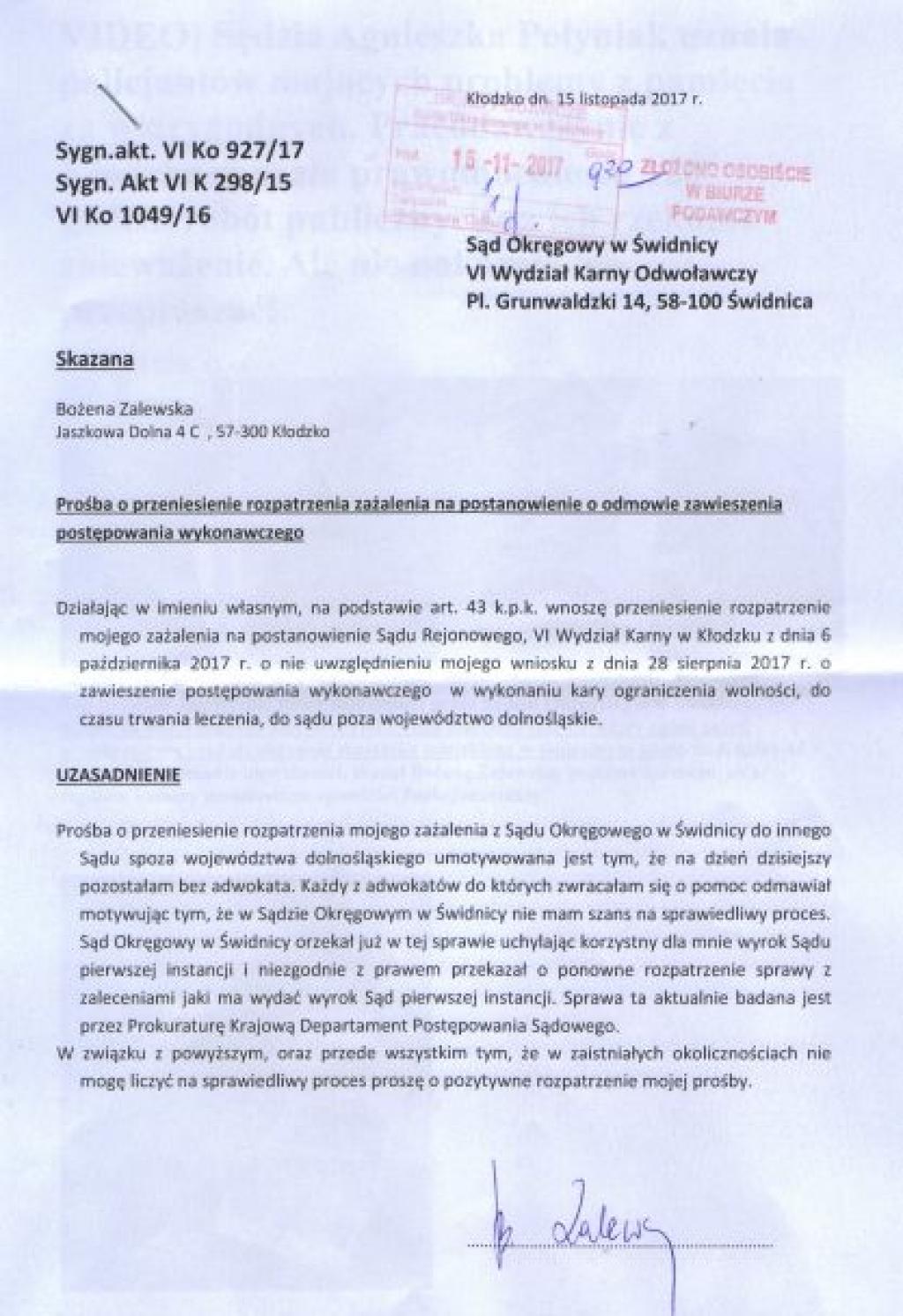 Jutro tj. 21 listopada 2017 r. zażalenie Bożeny Zalewskiej .ma rozpatrzywać Sąd Okręgowy w Świdnicy. Ale skoro, jak przyznał Sędzia Wizytator Krzysztof Płudowski, wszyscy orzekający tam sędziowie to prywatni znajomi prokurator Małgorzaty Sałackiej, biznesmenka złożyła wniosek o WYŁĄCZENIE CAŁEGO SĄDU Z ORZEKANIA W JEJ SPRAWIE.