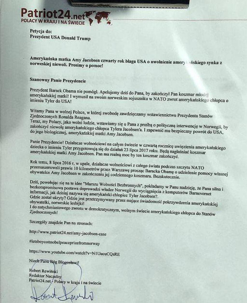 - Tak jak Prezydent Ronald Reagan wstawił się za Polskę, tak dzisiaj my wstawiamy się za więzionym amerykańskim dzieckiem. Prosimy Prezydenta USA Donalda Trumpa o skuteczną interwencję w Norwegii w celu jego uwolnienia. I zakończenia koszmaru matki Amy Jacobsen, która od czterech lat żyje w tym koszmarze - wyjaśnialiśmy wczoraj Januszowi Opas, który w imieniu Ambasady Stanów Zjednoczonych Ameryki przyjął naszą petycję wraz z wydrukiem naszego wczorajszego artykułu.