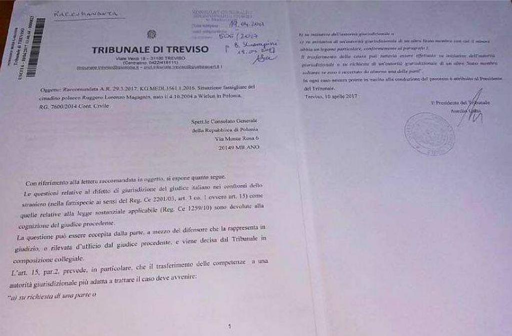 Oba dokumenty dołączamy do niniejszego tekstu. A we wtorek popołudniu połączymy się z Sądem Okręgowym w Sieradzu aby zapytać jak szybko Prezes wystosuje pismo do Treviso celem przejęcia sprawy.