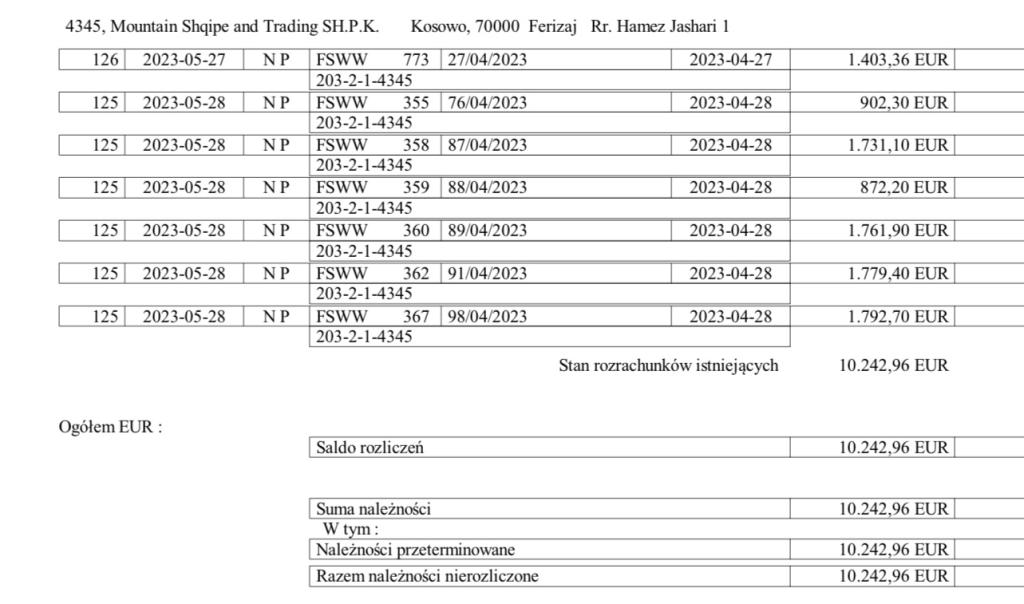 - Raphael B., Besitzer der deutschen Firma MOUNTAIN SHIPPING AND TRADING, die in Hamburg registriert ist, sowie der Firma MOUNTAIN SHQIPE AND TRADING aus Kosowo hat mir 100 000 Euro für realisierte Transporte nicht gezahlt. Angeblich wohnt er in Kosowo, aber in Wirklichkeit kann er andere Unternehmer und deutsche Finanzämter irreführen! - warnt der geschädigte Pole aus Schlesien.