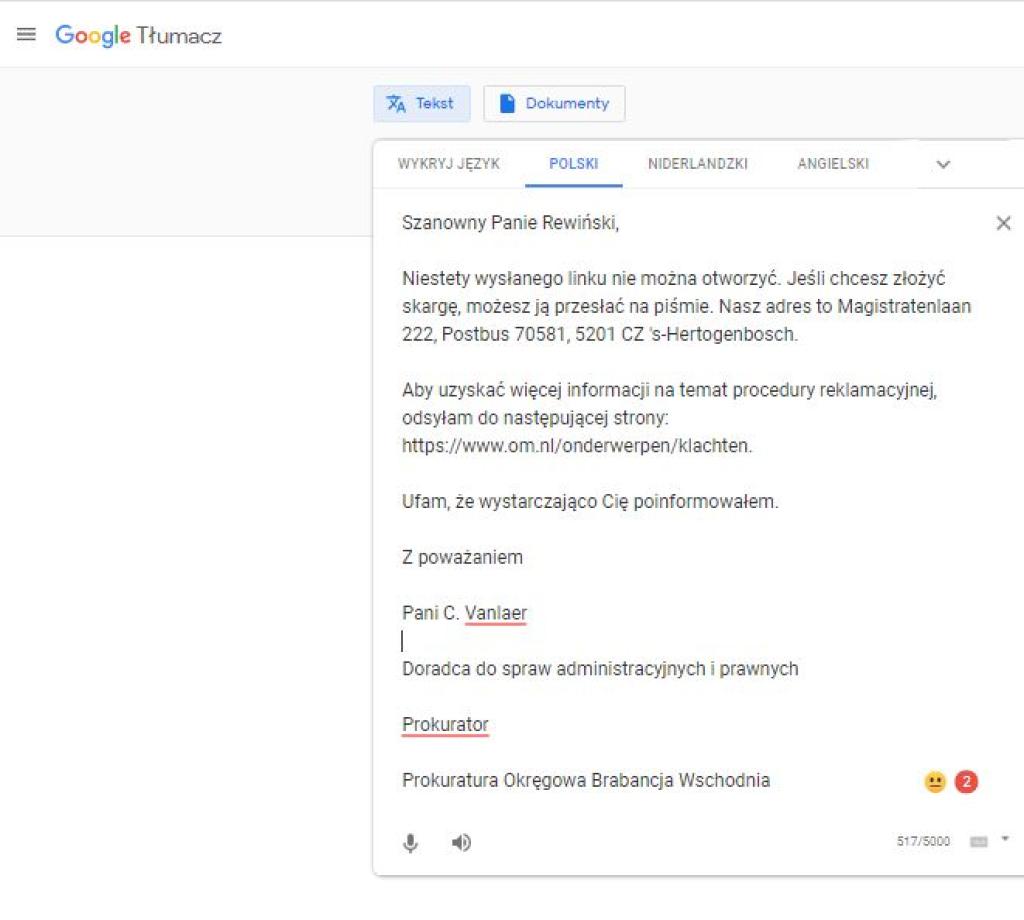 - W prokuraturze Oost Brabant jest co najmniej jeden ceryfikowany tłumacz języka polskiego, z którym ta prokuratura ma podpisany kontrakt. Pani prokurator C. Vanlaer, Pani prokurator Heleen Rutgers! Proszę natychmiast skorzystać z procedury Unijnej i zwrócic się do polskiego tłumacza, by Paniom ten nasz artykuł przetłumaczył na język niderlandzki - apeluje Robert Rewiński