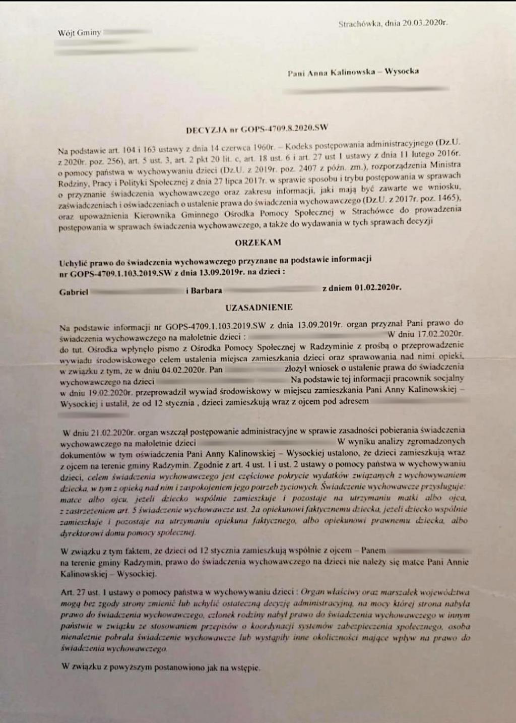 - To państwowe świadczenie pobierałam ja, jako matka, w Urzędzie Gminy Strachówka. Ale po porwaniu dzieci zostało mi ono odebrane bo Daniel W. oświadczył, że mieszka z dziećmi w Radzyminie - przekazuje matka prezentując dokumenty.