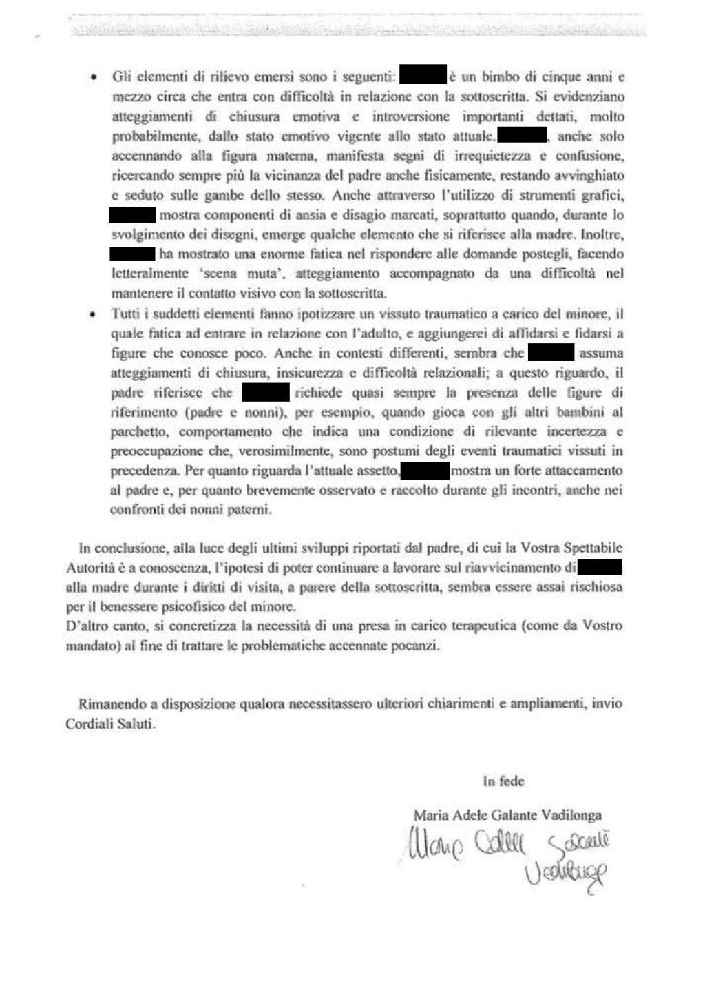 Als wir gelesen haben, was Psychologin Maria Adele Galante Vadilonga vorbereitet hatte, waren wir wieder erschüttert. Denn der Ausmass der Unfachlichkeit bei dem so für das Kind wichtigen Problem erschreckt! (das Dokument legen wir dem vorliegenden Text bei).