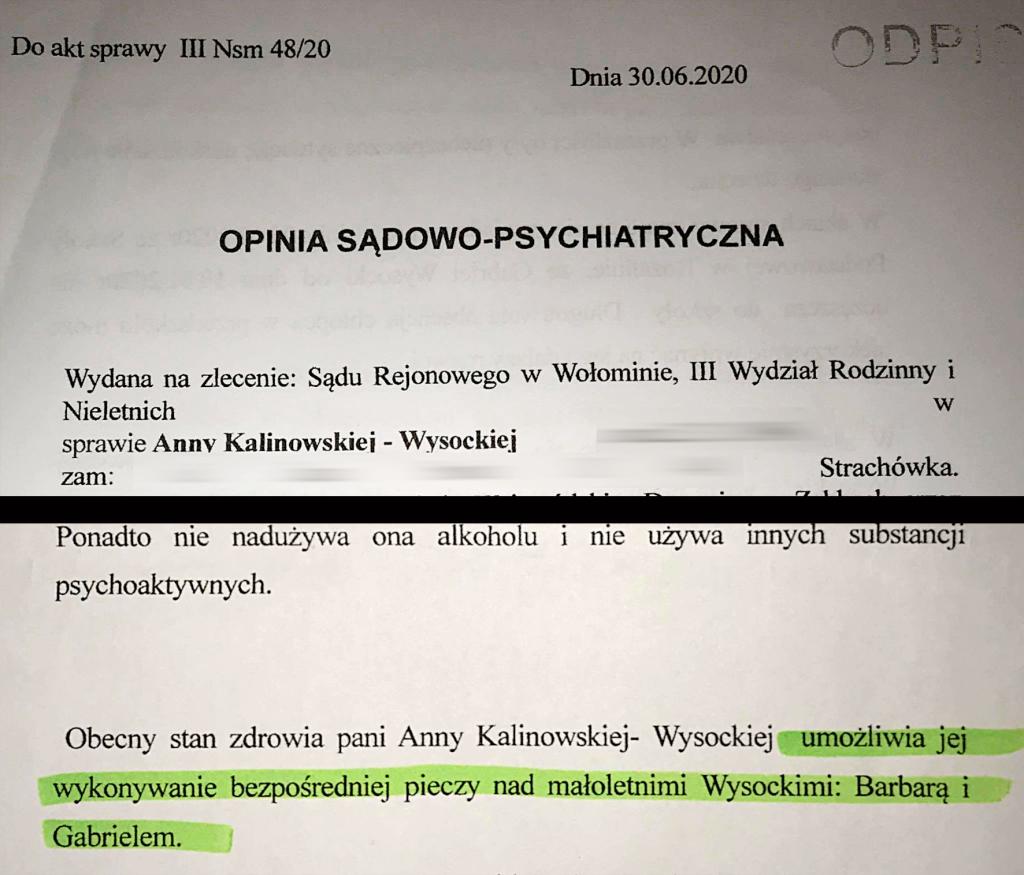 Anna Kalinowska-Wysocka spotkała się wczoraj z Komendantem Komisariatu Policji w Radzyminie Pawłem Piórkowskim, któremu te kłamstwa Daniel W., jako zwierzchnikowi funkcjonariuszy publicznych, przekazuje. Dodatkowo okłamuje go, szkalując matkę, że „jest chora psychicznie”. Mimo że ta posiada zlecone przez Sąd orzeczenie specjalisty sądowego, który rekomenduje matce spotkania z dziećmi!